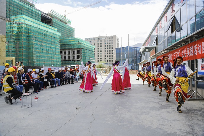在能源基地項目現場,青春洋溢的大學生隊員們以特色舞蹈展現了西藏地方文化。西藏大學帶隊老師向工人代表贈送了應急處置知識包,并向參建工人普及日常應急知識。隨后,師生們在集團公司安全監(jiān)管人員的帶領下,參觀了能源基地項目。