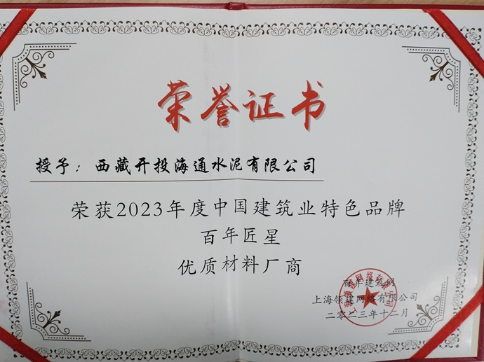 西藏開投海通水泥公司榮獲中國建筑業(yè)特色品牌百年匠星優(yōu)質(zhì)材料廠商榮譽稱號