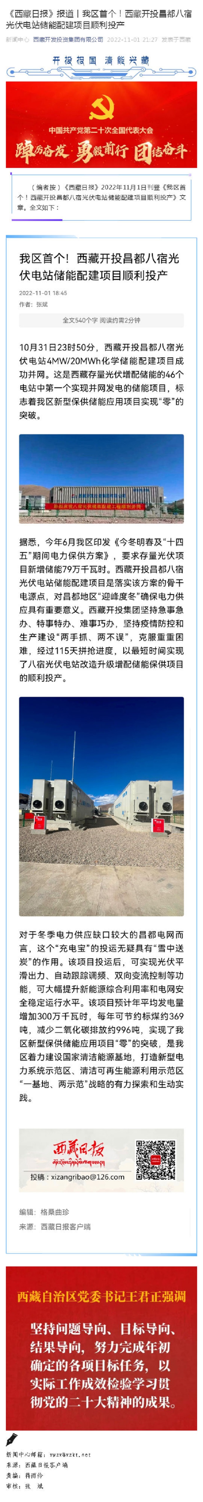 《西藏日?qǐng)?bào)》報(bào)道丨我區(qū)首個(gè)!西藏開投昌都八宿光伏電站儲(chǔ)能配建項(xiàng)目順利投產(chǎn)