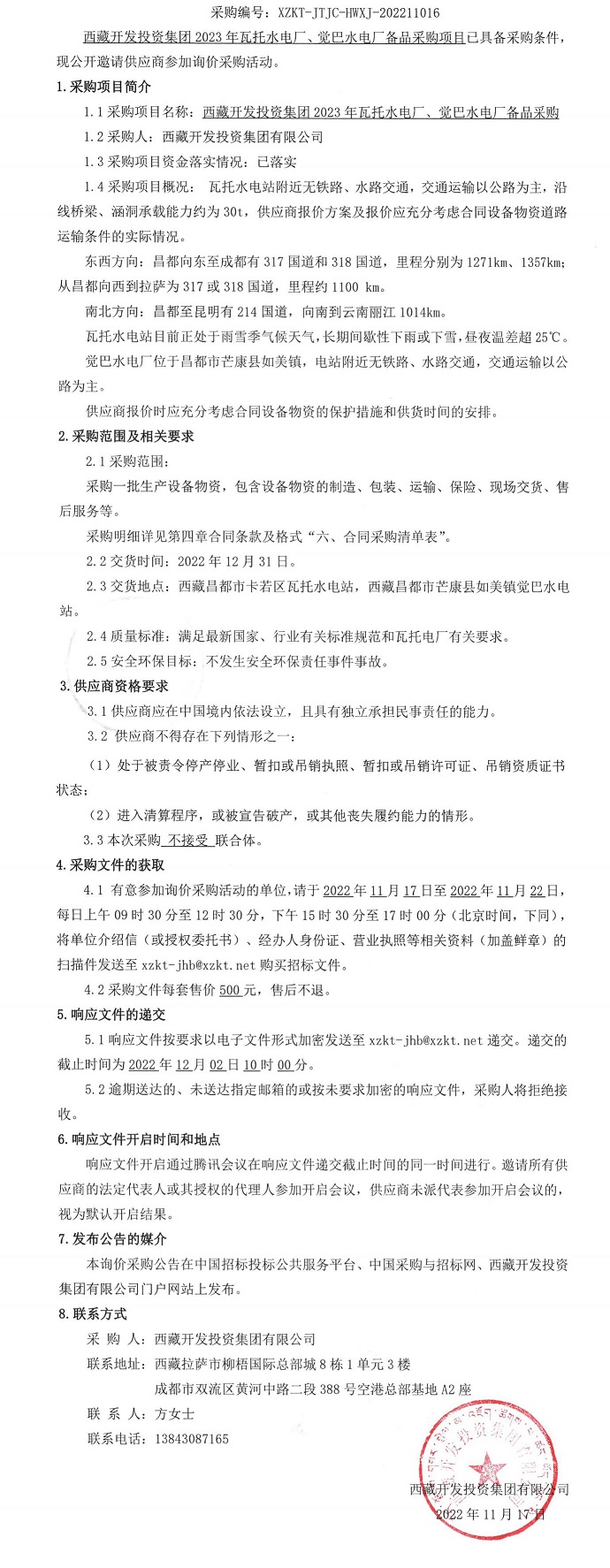 西藏開發(fā)投資集團2023年瓦托水電廠、覺巴電廠備品采購公告