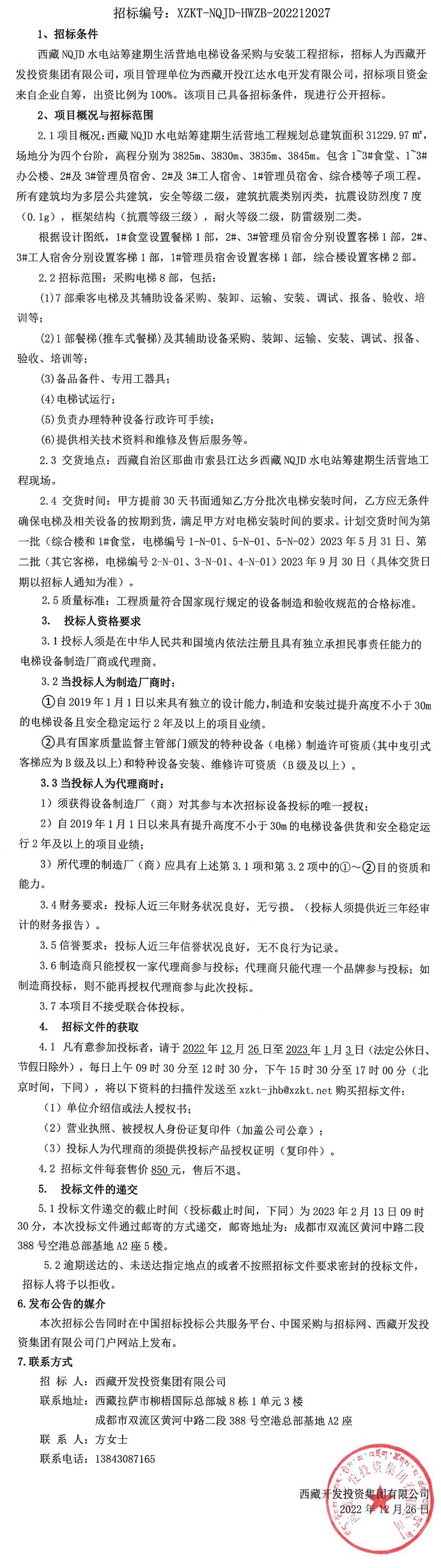 西藏NQJD水電站籌建期生活營(yíng)地電梯設(shè)備采購(gòu)與安裝工程