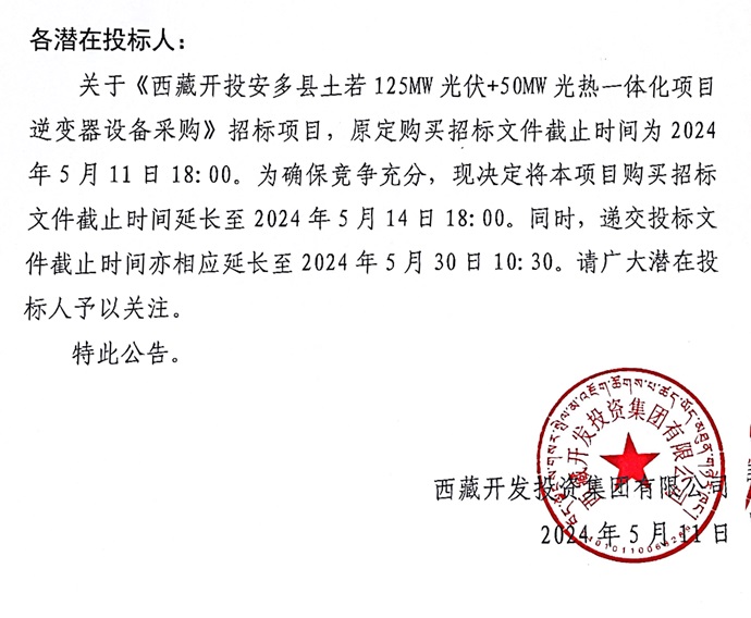 關(guān)于延長(zhǎng)《西藏開(kāi)投安多縣土若125MW光伏+50MW 光熱一體化項(xiàng)目逆變器設(shè)備采購(gòu)招標(biāo)》購(gòu)買招標(biāo)文件截止時(shí)間的公告