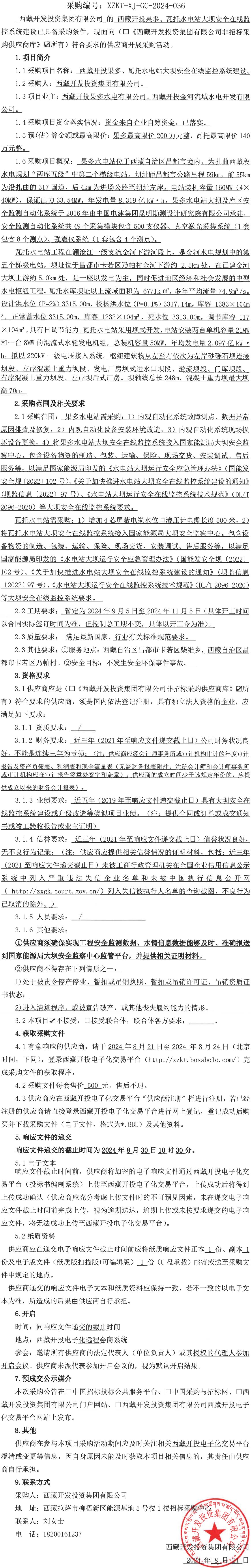 西藏開(kāi)投果多、瓦托水電站大壩安全在線監(jiān)控系統(tǒng)建設(shè)詢價(jià)采購(gòu)公告