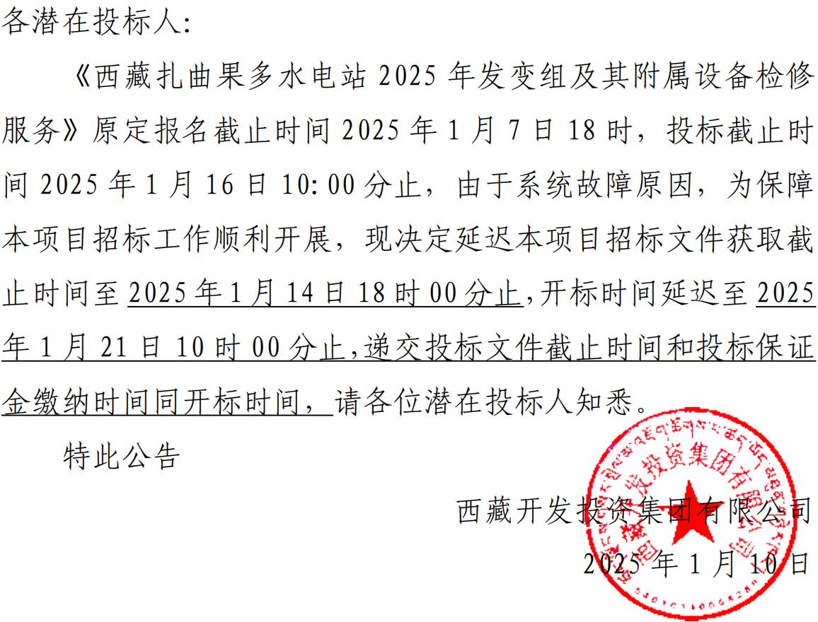 關(guān)于延長《西藏扎曲果多水電站 2025 年發(fā)變組及其附屬設(shè)備檢修服務(wù)》報(bào)名及投標(biāo)截止時(shí)間的公告